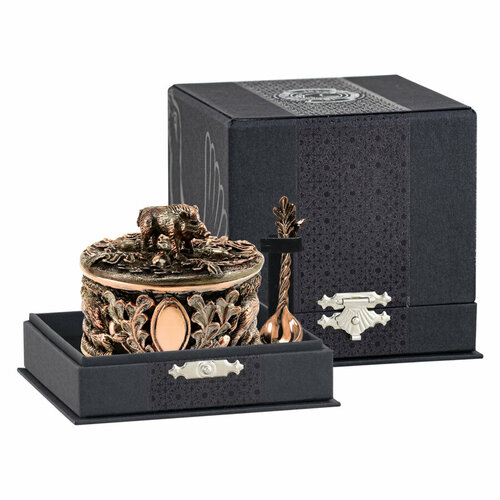 Солонка с ложкой в футляре Кольчугинский мельхиор с чернью 7,5 см, медь