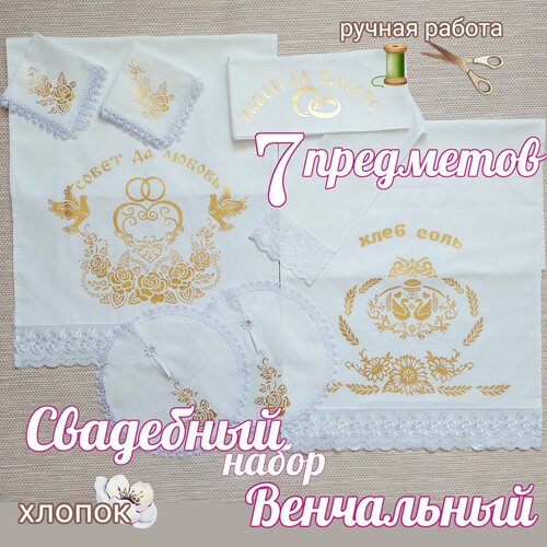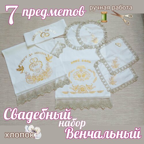 Венчальный набор свадебный рушник " Хлеб Соль"белое золото, 7 предметов: 3 рушника, 4 салфетки