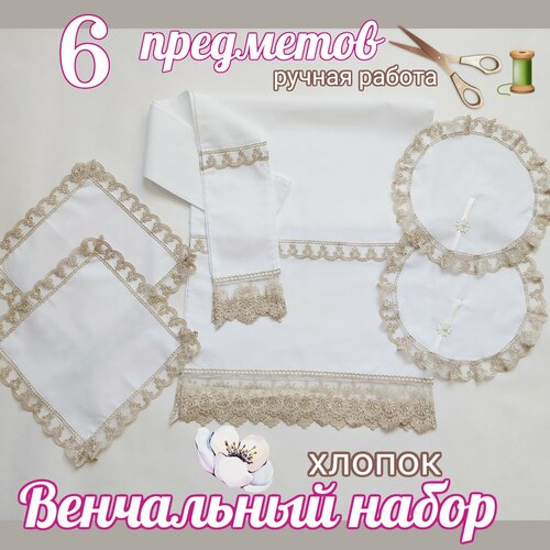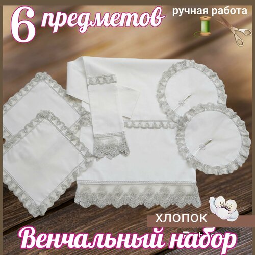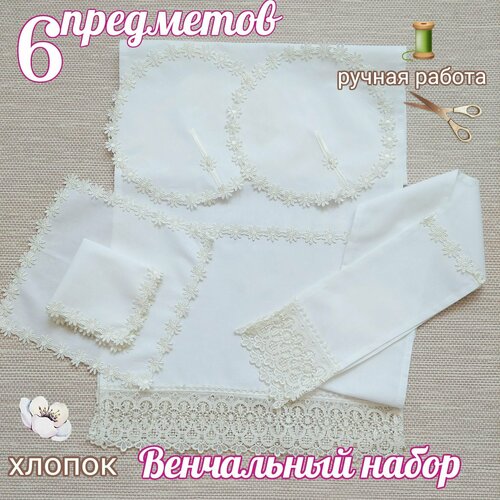 Венчальный набор " Цветок персика" белый/кремовый, 6 предметов: рушник, салфетки
