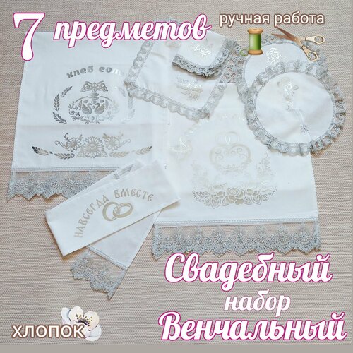 Венчальный набор свадебный рушник " Хлеб Соль" серебро, 7 предметов: 3 рушника, 4 салфетки