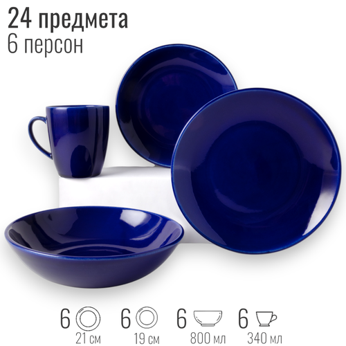 Набор посуды столовой на 6 персон, 24 предмета, однотонный цвет, тарелки и кружки керамика
