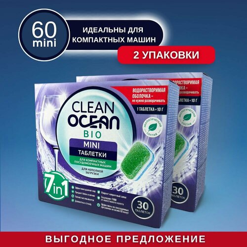 Мини таблетки для посудомоечной машины с энзимами в водорастворимой пленке Clean Ocean Bio "7 в 1" 600 г. 60 шт. Эко-таблетки mini для посудомойки ПММ