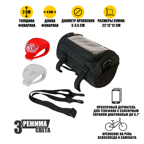 Велосумка VB-02 на руль велосипеда и фонари велосипедные, белый и красный