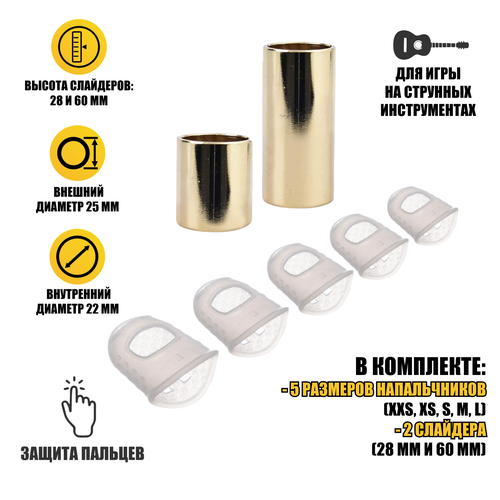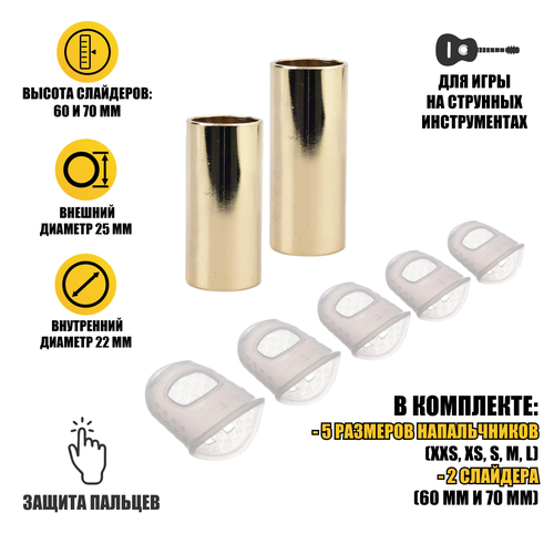 Слайдеры, высота 60 и 70мм, сталь, цвет золото и напальчники силиконовые белые для игры на гитаре, размер XXS, XS, S, M, L