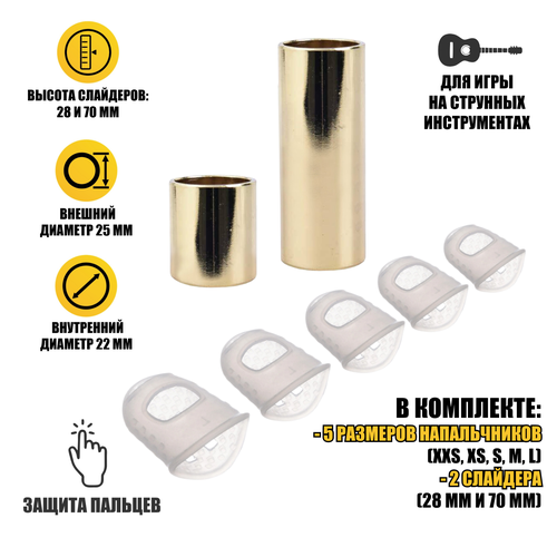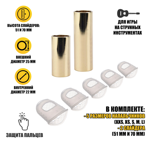 Слайдеры, высота 51 и 70мм, сталь, цвет золото и напальчники силиконовые белые для игры на гитаре, размер XXS, XS, S, M, L