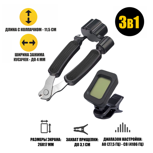 Тюнер-прищепка XRT01 для гитары и инструмент для замены струн: вертушка, ключ, кусачки