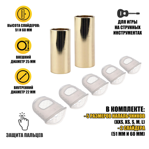 Слайдеры, высота 51 и 60мм, сталь, цвет золото и напальчники силиконовые белые для игры на гитаре, размер XXS, XS, S, M, L