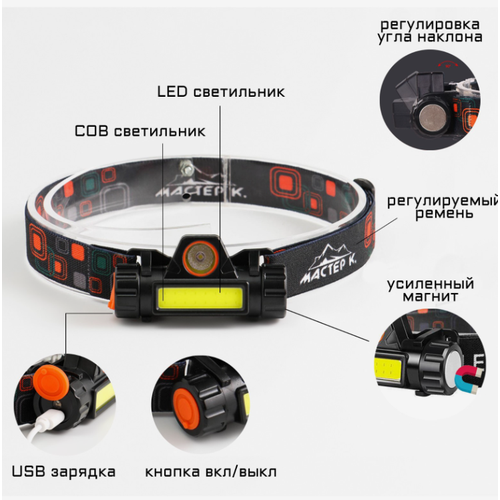 Фонарь налобный аккумуляторный "Мастер К.", 5 Вт, 140 лм, 1200 мАч, 3 режима, USB