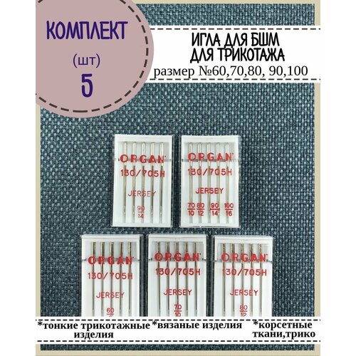 Иглы БШМ Organ для трикотажных тканей(джерси) №60,70,80,90,100, в пенале 5 шт, комплект 5 пеналов