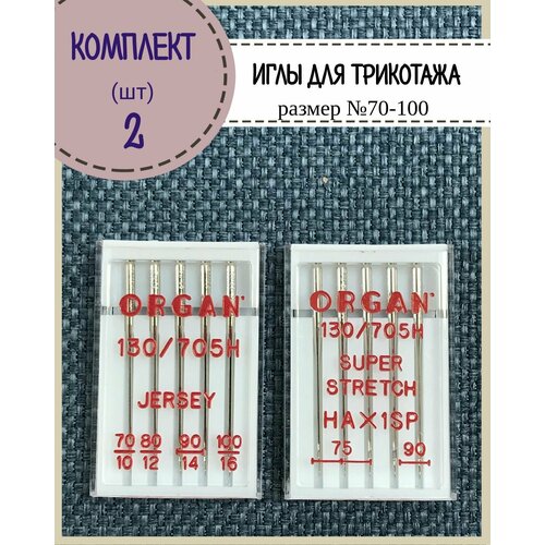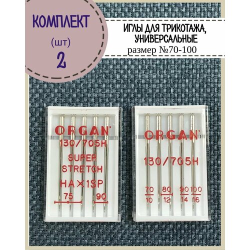 Иглы для бытовой швейной машины универсальные/трикотажные (супер стрейч) Organ №70,75,80,90,100 в пенале 5 шт, комплект 2 пенала