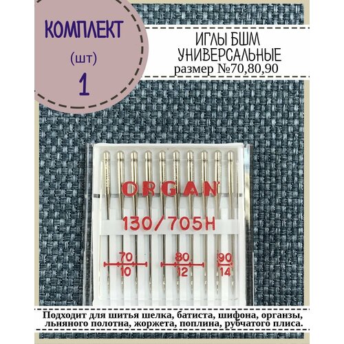 Иглы для бытовой швейной машины универсальные Organ для тонких и средних тканей №70,80,90, в пенале 10 шт, комплект 1 пенал
