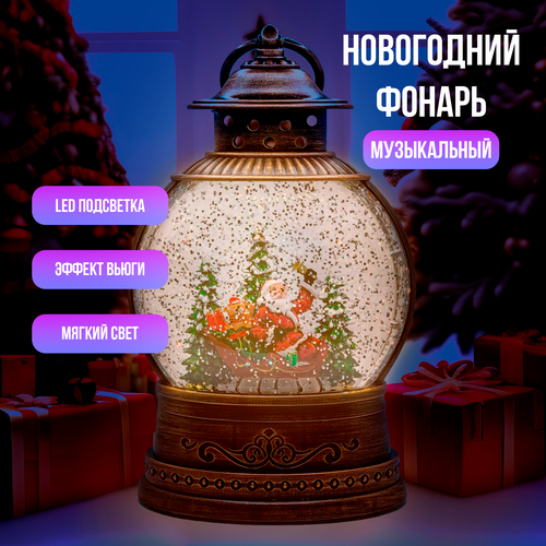 Новогодний светодиодный фонарь Дед Мороз на Санях, 20см, светящийся, музыкальный, USB