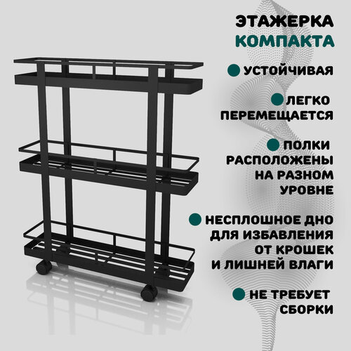 Узкая этажерка на колесиках для кухни и ванной компакта 60х15х75 см черная матовая, металлическая 3 яруса