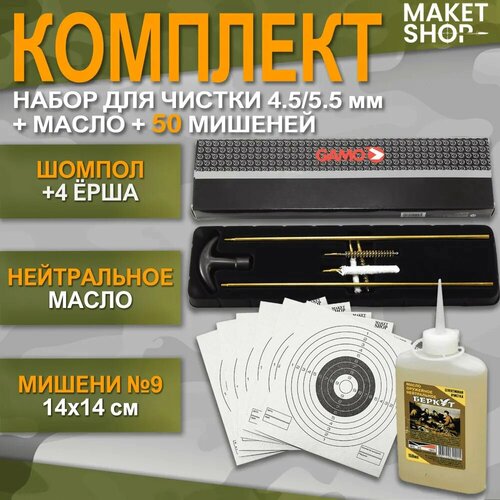 Набор для чистки пневматики 4,5/5,5 / Мишени для стрельбы 14x14 см 50 шт. / Масло нейтральное 150 мл.