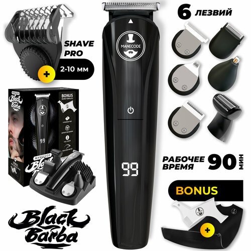 Триммер для бороды и усов Manecode BLACK BARBA 12 в 1 с насадками для носа, ушей и тела и регулируемой насадкой SHAVE PRO, в комплекте фартук и трафарет для бритья