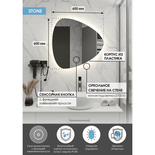 Зеркало Max Mirrors 60х60 тёплая LED подсветка, сенсор с диммером, класс защиты IP44, без рамы, для ванной, дизайнерское, неправильной формы.