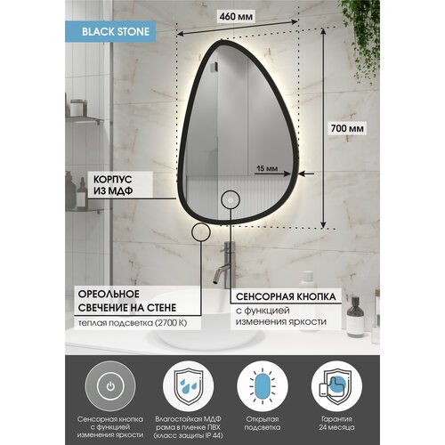 Зеркало для ванной, интерьерное парящее Stone Black №1 70х46 см овал чёрная рама c тёплой LED фоновой подсветкой и сенсорным включателем с диммером