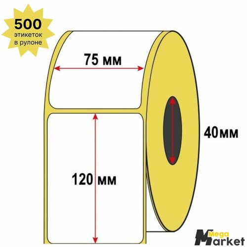 Термоэтикетки ЭКО 75х120, 500 этикеток в рулоне, втулка 40 мм, самоклеящиеся для термопринтеров, экономичная намотка