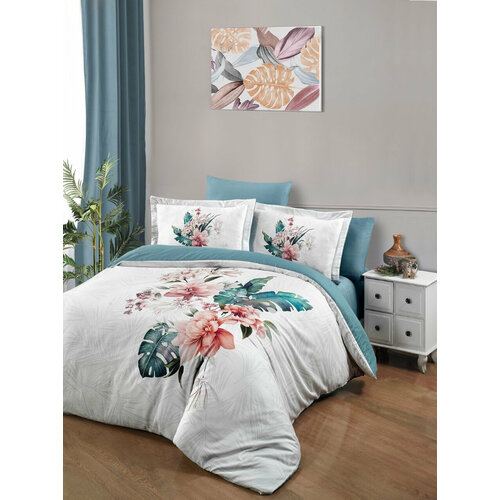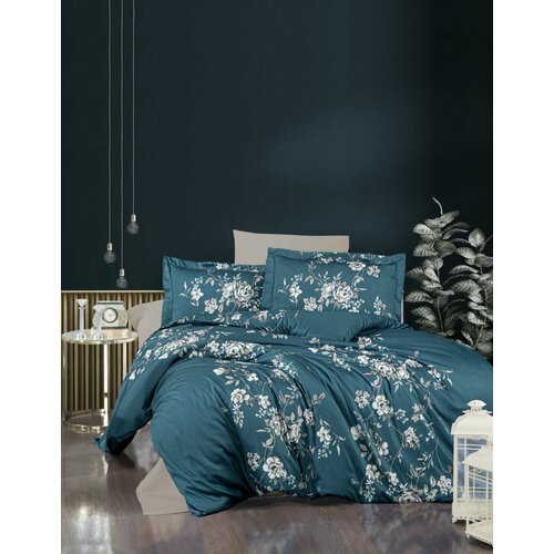 Постельное белье из сатина люкс Adelen Doco (кремовый-бирюзовый), Евро (наволочки 50х70 и 70х70)