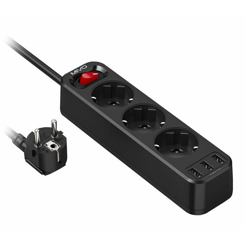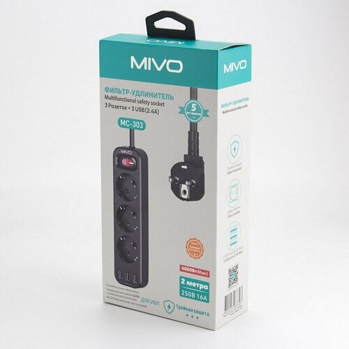 Удлинитель электрический 2 метра Mivo MС-303 3 розетки с/з + 3 USB (сетевой фильтр)