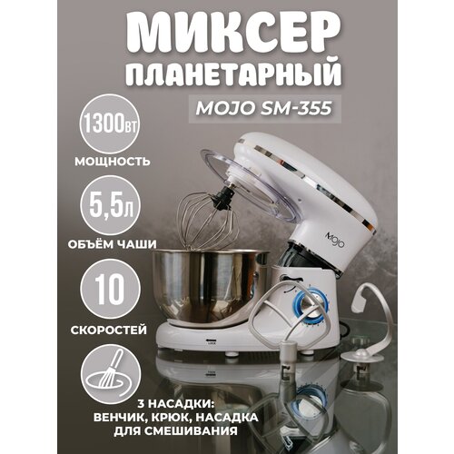 Миксер планетарный MOJO SM-355, объем чаши 5.5 л, 1300 Вт, 10 скоростей, импульсный режим