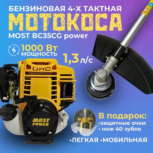 Бензиновая мотокоса. Триммер садовый MOST BC35CG 1,0кВт/1,3 лс, 4-тактная, фреза 3 зуба, неразъемная штанга, велосипедные ручки