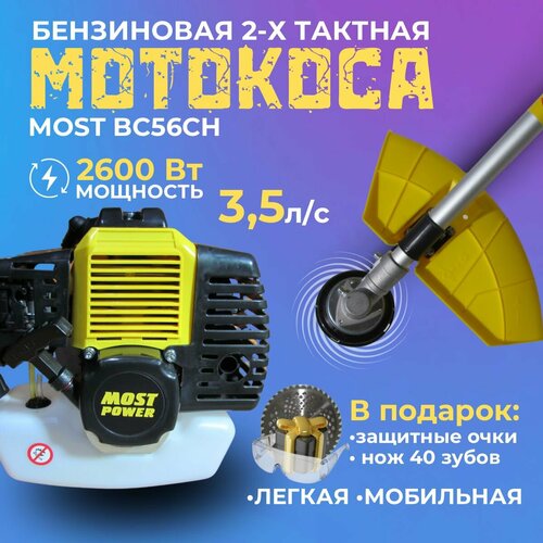 Бензиновая мотокоса. Триммер садовый MOST power BC56CH 2,6кВт/3,5лс, неразъемная штанга, фреза 3 зуба, велосипедные ручки, стандартный ремень