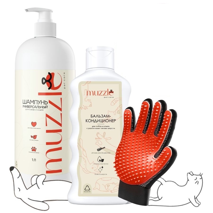 Набор для кошек и собак Muzzle Укротитель линьки, шампунь 1 л, бальзам 250 мл, перчатка N-ANTIL