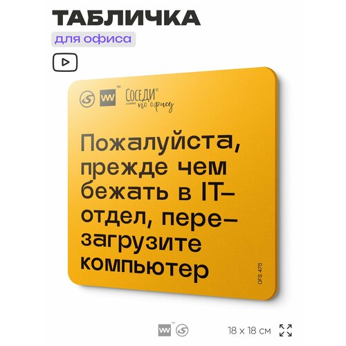 Табличка с правилами офиса "Прежде чем бежать в IT-отдел, перезагрузите компьютер" 18х18 см, пластиковая, SilverPlane x Айдентика Технолоджи