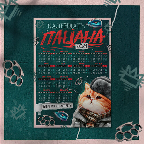 Магнит на холодильник "Календарь пацана 2024", Чёрный, Размер А4 (290х210 мм), материал ПВХ+магнитный винил