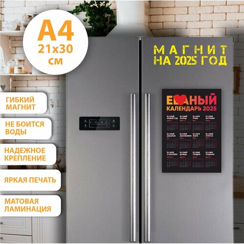 Магнит на холодильник "Грёбаный(Ё**ый) календарь 2025", Чёрный, Размер А4 (290х210 мм), материал ПВХ+магнитный винил