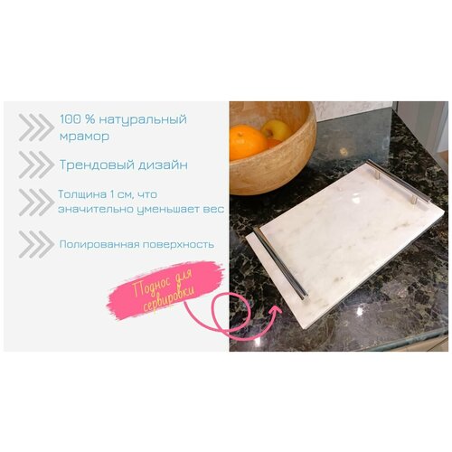 Поднос 30х20 см, из мрамора с ручками хром, белый