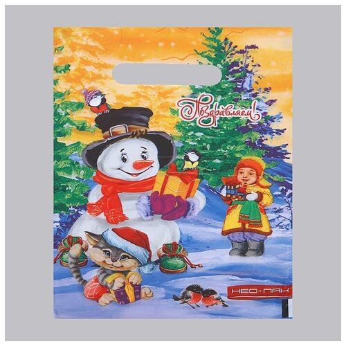 Пакет "Мишка с елкой", полиэтиленовый с пластиковой ручкой, 37 х 35 см, 90 мкм (5шт)