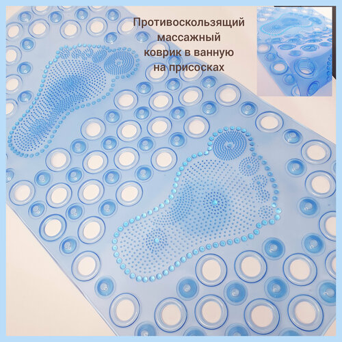Коврик в ванную противоскользящий массажный на присосках 63*33см / силиконовый коврик /прозрачный голубой антискользящий коврик /подарок бабушке