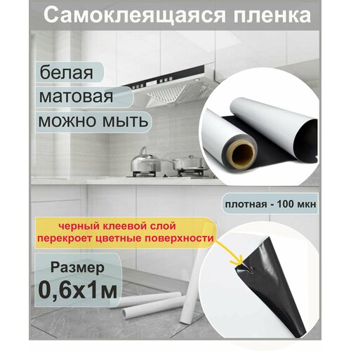 Самоклеящаяся белая пленка для мебели, для дизайна и интерьера. С черным клеевым слоем. Матовая, 100 мкн. 0,6х1 метр.