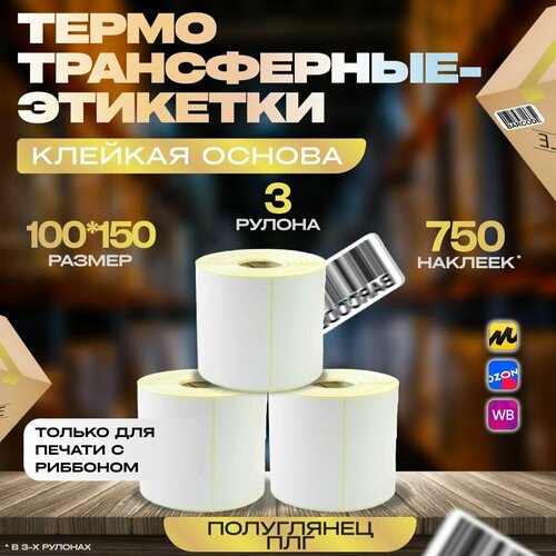 Термотрансферные этикетки 100х150мм (250 шт/рул) 3шт, самоклеящиеся в рулоне, внешний диаметр рулона 90мм, 40мм полноразмерная втулка