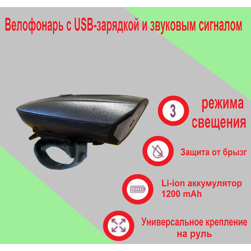 Велофонарь с USB-зарядкой и звуковым сигналом . Чёрный
