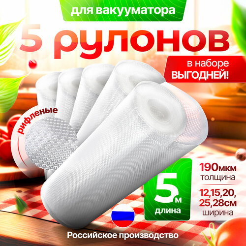 Пакеты для вакууматора рифленые, набор 5 рулонов 12, 15, 20, 25, 28 см