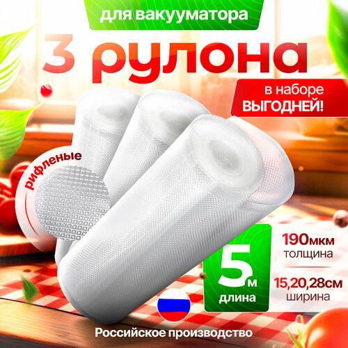 Пакеты для вакууматора рифленые, набор 3 рулона 15, 20, 28 см