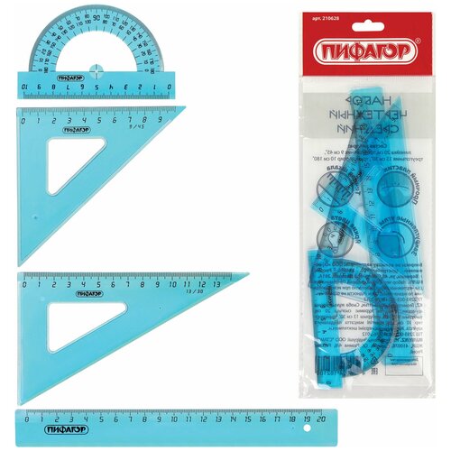 Набор чертежный средний пифагор (линейка 20 см, 2 треугольника, транспортир), тонированный, европодвес, 210628