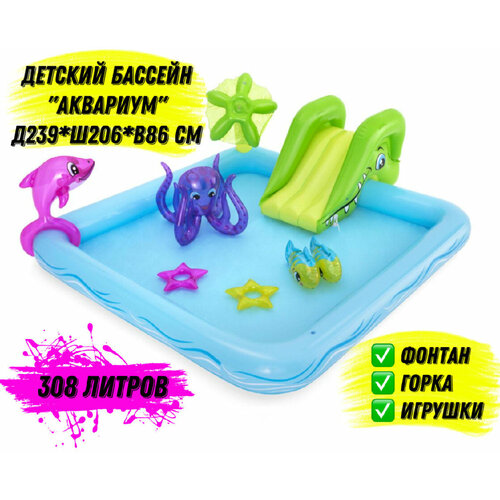 Бассейн игровой "Аквариум" с разбрызгивателем, горкой и игрушками, 239х206х86 см, 308 л.