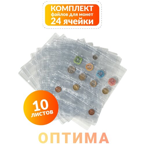 Листы для альбома коллекционера нумизмата, Файлы для монет формата Optima вертикальные на 24 ячейки, комплект 10 штук