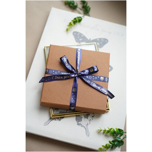 Лента декоративная атласная с печатью С днем рождения темно-синий/золото из сатина, ширина 15 мм, длина 5 м