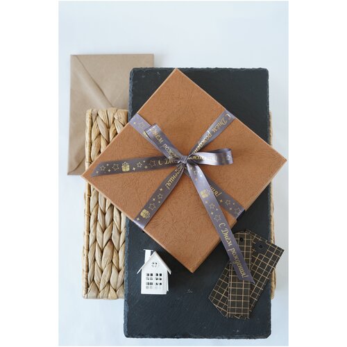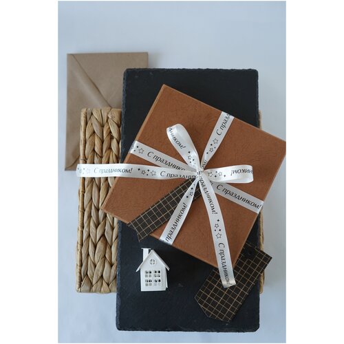 Лента декоративная атласная с печатью С праздником/черный из сатина, ширина 15 мм, длина 5 м