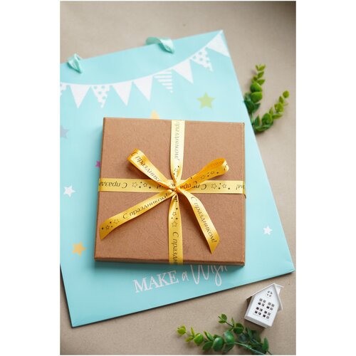 Лента декоративная атласная с печатью С днем рождения/матовое золото из сатина, ширина 15 мм, длина 5 м