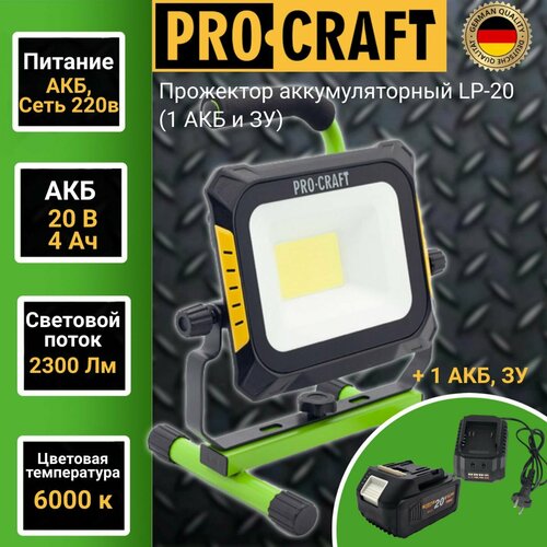 Прожектор строительный светодиодный аккумуляторный Procraft LP20 (1АКБ + 1ЗУ), 20В 4А/ч