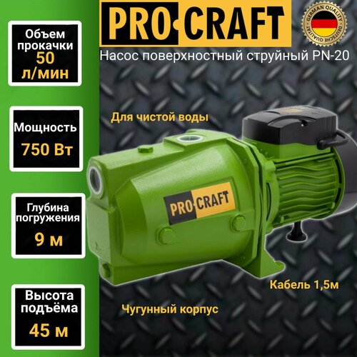 Насос поверхностный струйный Procraft PN20, 750Вт, 50 л/мин, напор 45м, погружение 9м