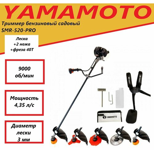 Триммер бензиновый садовый для травы Yamamoto SMR-520 PRO, 2х тактный двигатель, Бензокоса, 3200 Вт, 9000 об/мин, 4,35 л. с.