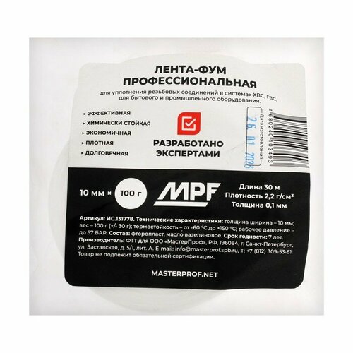 Лента ФУМ Masterprof ИС.131778 PROFESSIONAL, 10 мм х 0,1 мм х 30 м, фторопластовая