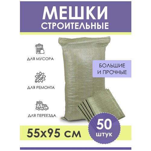 Строительные мешки для мусора зеленые 55х95 см (50 штук), прочные мусорные мешки полипропиленовые для хранения, переезда, садоводства